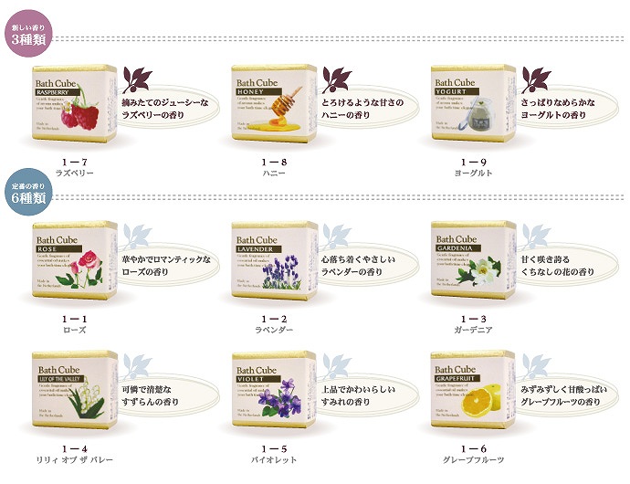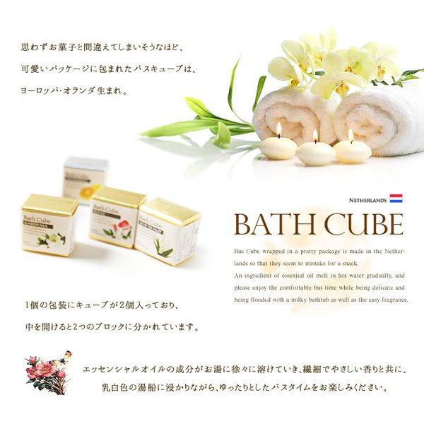 オランダ生まれの可愛いバスキューブ。エッセンシャルオイルの成分がお湯をまろやかにし、つるっとした肌ざわりをお楽しみいただけます。